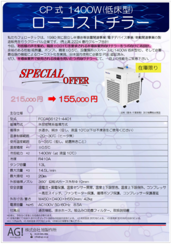 半導体関連製品の製造販売を行う ”フェローテックマテリアルテクノロジーズ” が開発した、ラボ向け「ローコストチラーFCCAシリーズ」を、特別価格でご提供します。